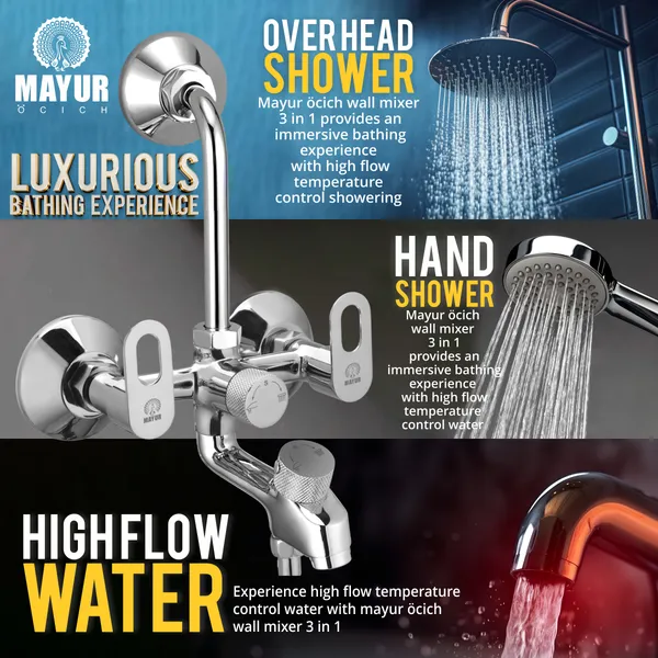 Be the first to review “MAYUR ÖCICH Brass 3-In-1 Wall Mixer Tap For Bathroom With Overhead & Hand Shower Arrangement | Chrome Finish | Hot & Cold Water Mixer | 10-Year Warranty”
