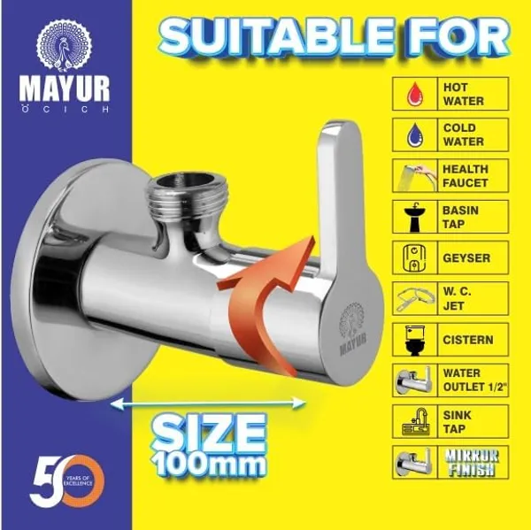 Mayur An Angle Valve/Cock Engineered And Designed To Withstand The Test Of Time. Solid Brass Construction For Durability And Reliability. Universal Thread To Support Your Geyser, Basin Mixer, Pillar Tap, Sink Mixer, Wall Mixer, Kitchen Sink Tap, Health Faucet, Jet Spray, Tube Hose Connection Pipe, Water Tap, Mixer Tap, Bathroom Mixer Tap, 2 Way Angle Valve, Angle Valve Geyser, Two Way Angle Valve, Hot Cold Tap, 2 Way Angle Cock, Angle Tap, Mixer Tap Kitchen Sink, Water Mixer Tap, Mixture Tap Ki. Elegant Yet Simple Design Which Will Complement Your Bathroom Or Kitchen Fittings. Material: Brass, Color: Chrome Finish 0.3 Microns (Long Lasting Shine) 10 Years Warranty Provided By The Manufacturer. Full Brass Body Makes It Ultra-Durable In Tough Indian Conditions. Function- Mixes Hot & Cold Water (Silky Smooth Operation) Suitable For All Kinds Of Bathroom & Kitchen (Easy To Install) (Wall Mounted) Strong Brass Construction :Single Body Brass Construction. User Guide :- Please Flow Water Through The Pipeline Before Installation To Remove Any Dirt / Debris Or Sand Particles. Clean Faucet Only With A Dry Cloth (Dont Use Any Chemicals). Why Choose Mayur? We Are Manufacturing Bathroom Fittings For The Past 47 Years Now. Mayur Products Are Inspired By Need & Designed With Passion. Which Is Why Each Series In Mayur’S Catalogue Is Different From The Conventional Industry Designs. Our Product Quality Is Equivalent To Brands Like Our Product Quality Is Equivalent To Brands Like Mayur Products Will Give Your Home, Bathroom & Kitchen A Fresh Look. Every Product Is Hand Built In Our Facility And Goes Through Rigorous Testing At Every Stage Before Being Dispatched. We Have So Much Faith In Our Products That We Offer Best In The Industry Warranty Of 10 Years. (Your Order Id Is Your Warranty Card).