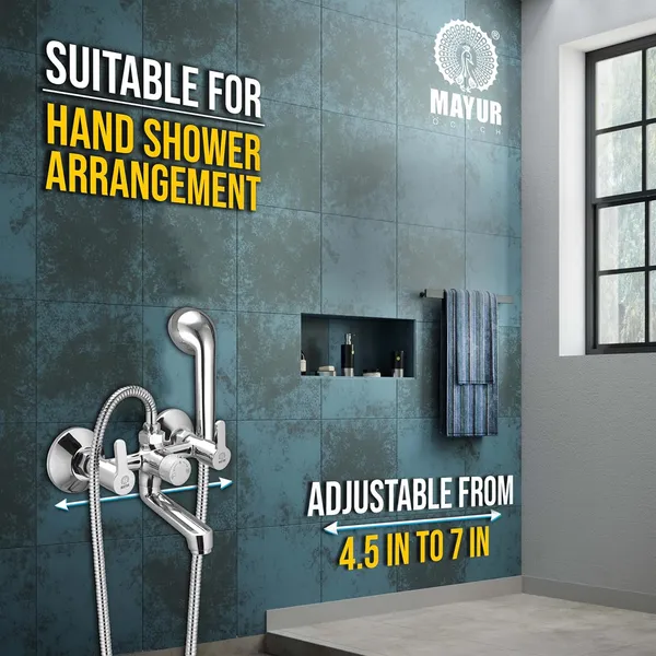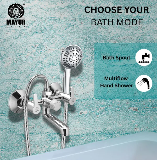 Elevate your bathroom with this versatile wall mixer featuring a 3-mode selector (Spout, Off, Shower) for tailored water flow. Designed with double water leakage protection, it ensures durability and reliability. The set includes a multi-flow hand shower, a 1.25-meter flexible hose, and a hook for custom overhead-style placement, making it ideal for diverse Indian bathroom setups.