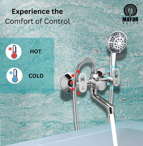 MAYUR ÖCICH Brass Wall Mixer Tap For Bathroom With 5-Function Hand Shower, 1.5M Ss Hose & Hook (Fusion) | Chrome Finish Hot & Cold Water Mixer, Wall Mounted, 10-Year Warranty